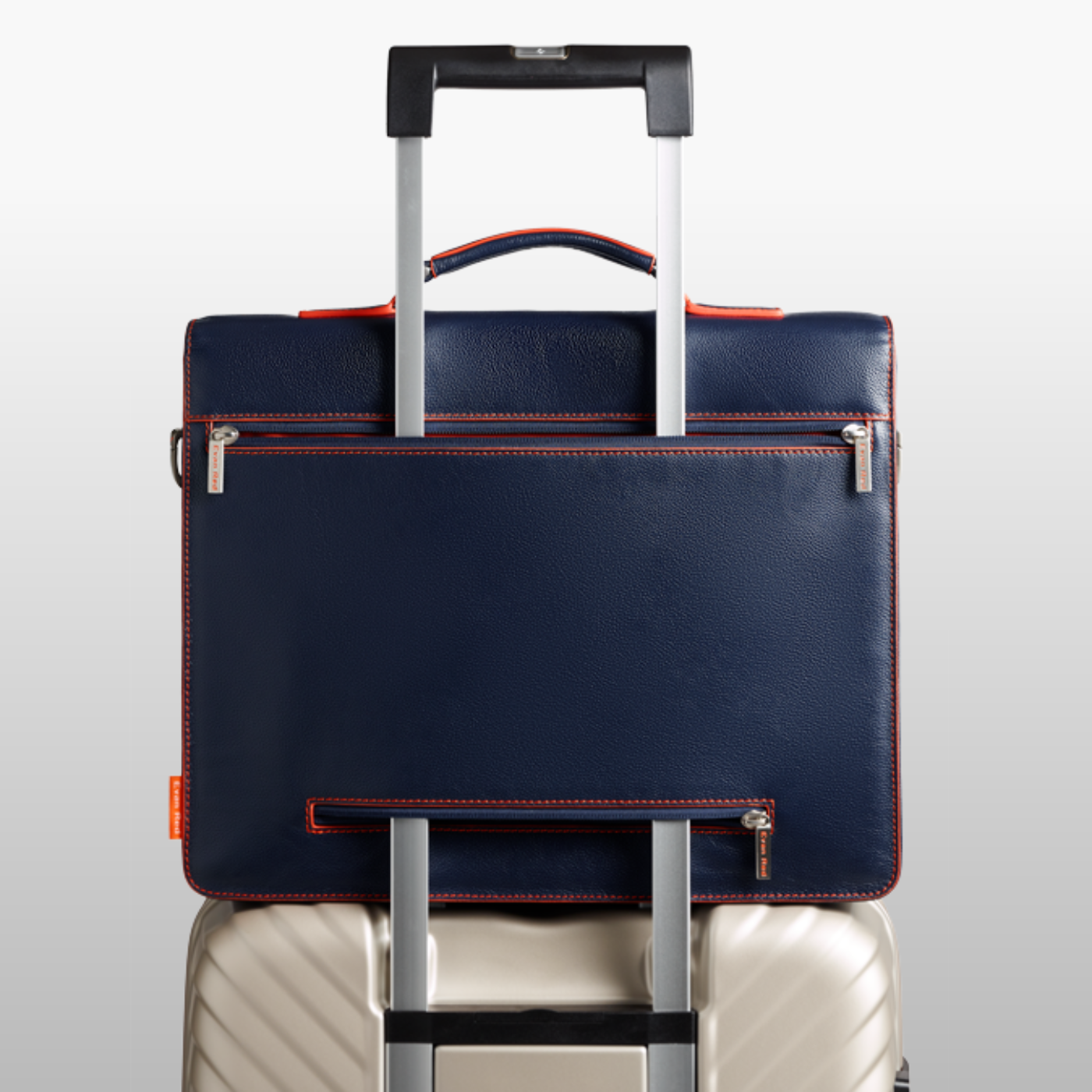 The Amsterdam briefcase features a dual-zip luggage sleeve, allowing you to effortlessly secure it to your trolley